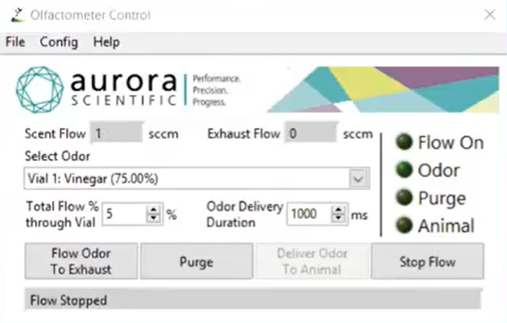 The creators of Aurora made a minimalistic visual interface where the user can select the odor, delivery duration, and flow. Furthermore, LEDs are displayed on the computer in addition to the box along with the control buttons that are implemented to manage the execution. The price for this olfactometer commercialised by Aurora scientific is 12 500€