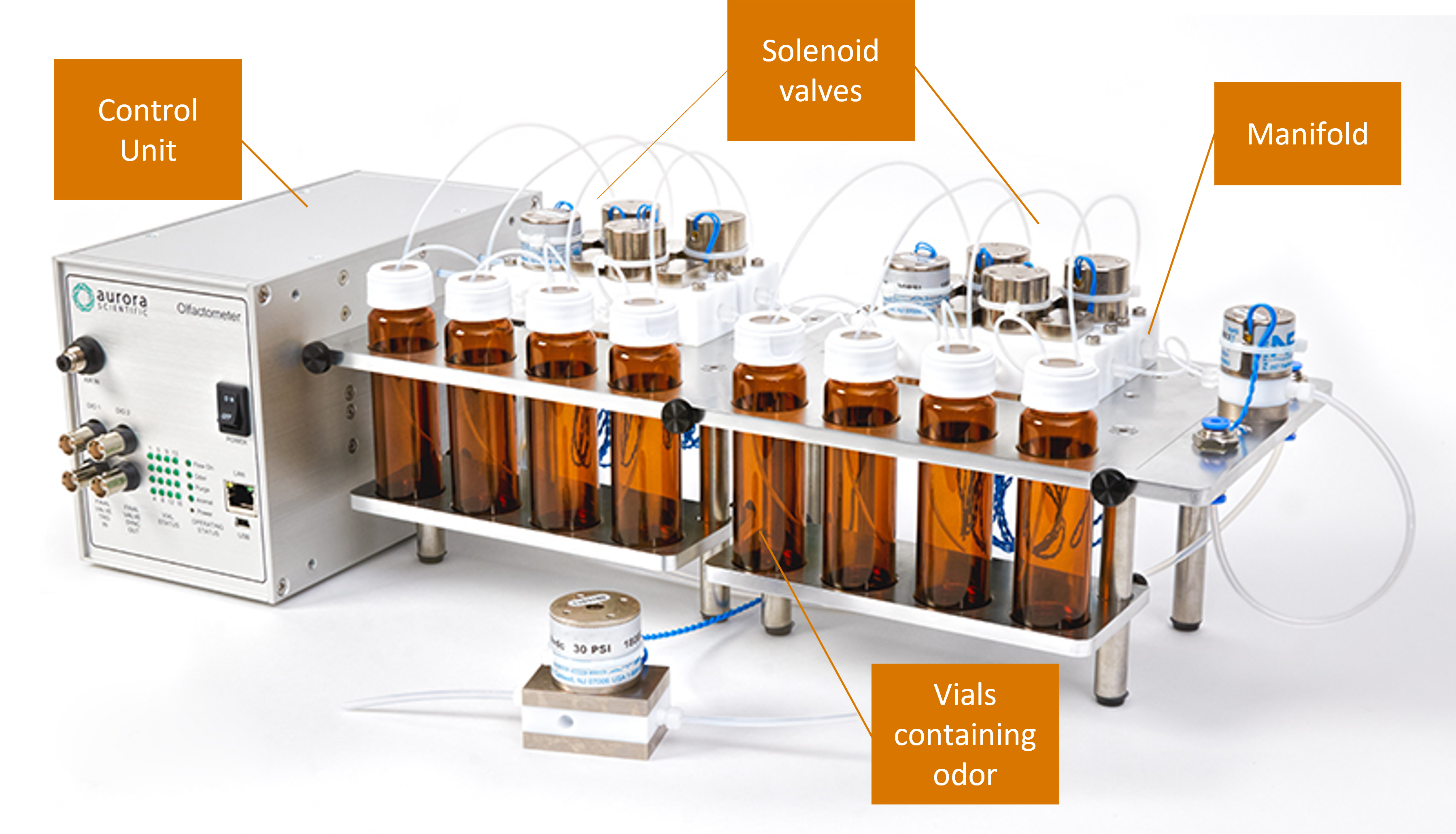 Flow olfactometers were adapted to be used in mice for studying olfactory sense in behavioral research. There is a wide range of options available in terms of complexity, price, and portability. An example in the industry is the Aurora olfactometer depicted in Figure 3. This olfactometer features a compact design that offers automated delivery of odors. The design has space for odor vials, valves, and a control unit. The control unit contains several compartments that are essential to be used in the experiments, such as flow controllers and led indicators. Flow controllers are used for maintaining the flow at a certain level, while the led indicators show the ongoing incident. This unit also contains USB and LAN ports for connection to the computer. The other compartment contains a manifold that keeps the valves together. These valves are connected to the odor vials through input and output tubes, with the input tube being longer, thus creating a headspace between the two tubes. The output tubes are responsible for picking up the odor and carrying it to the mouse.