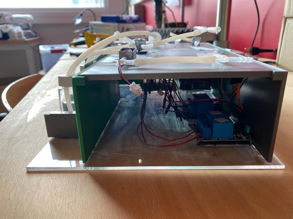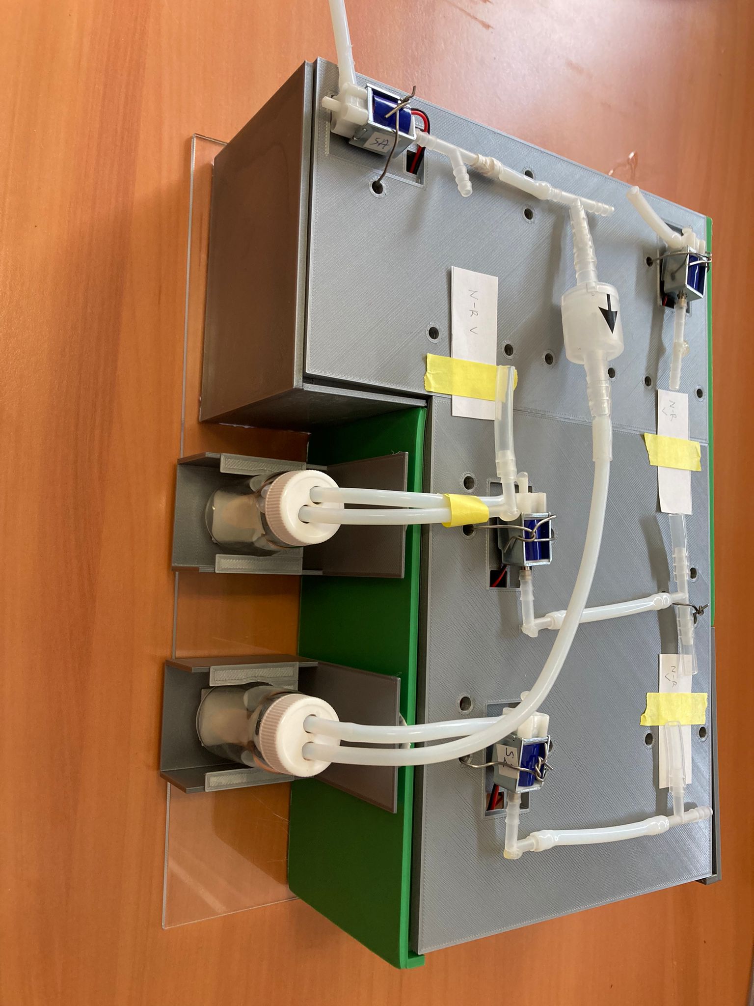 We then tested the device with water to test different conditions of pressure and time. We were also very happy to see that the air travelled through the tubes and created bubbles in the water as you can see in the video.