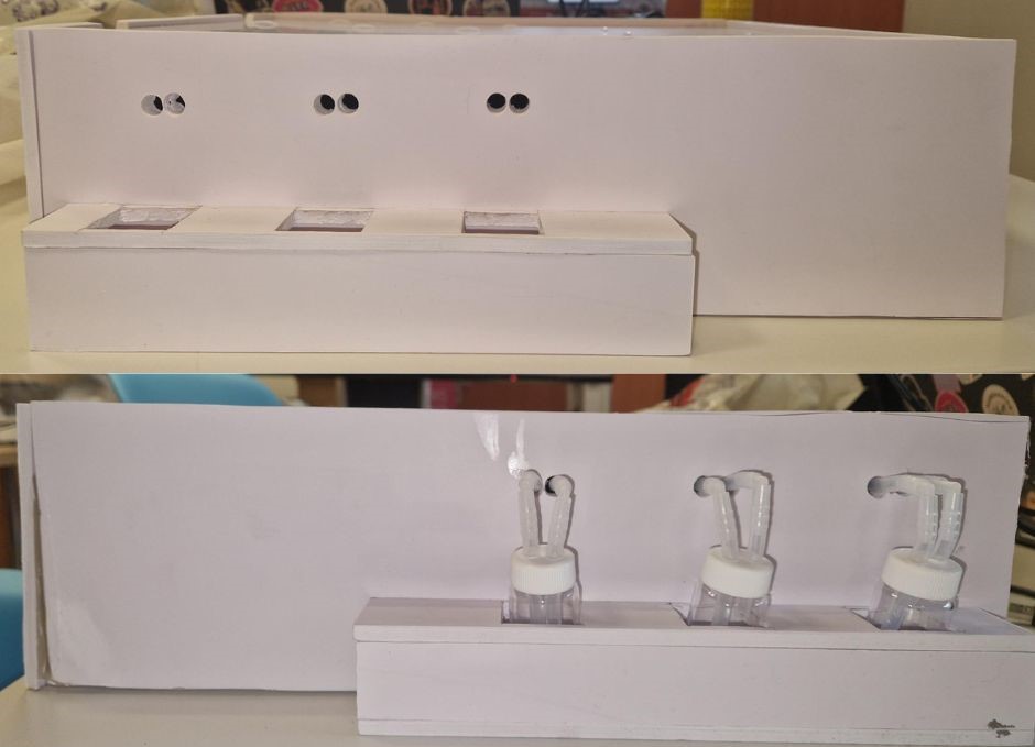 Additionally, we built vial boxes for both sides of the olfactometer using the same material as the main box. Despite the absence of a laser cutter, we used traditional tools to cut and assemble the boxes with precision. This allowed us to create functional and cohesive components that seamlessly integrate with the olfactometer.