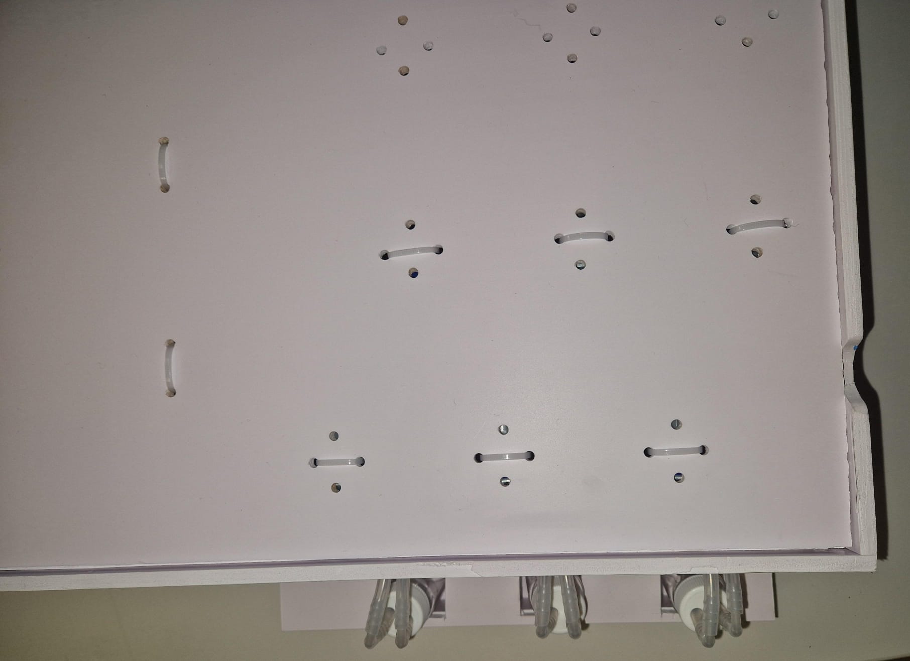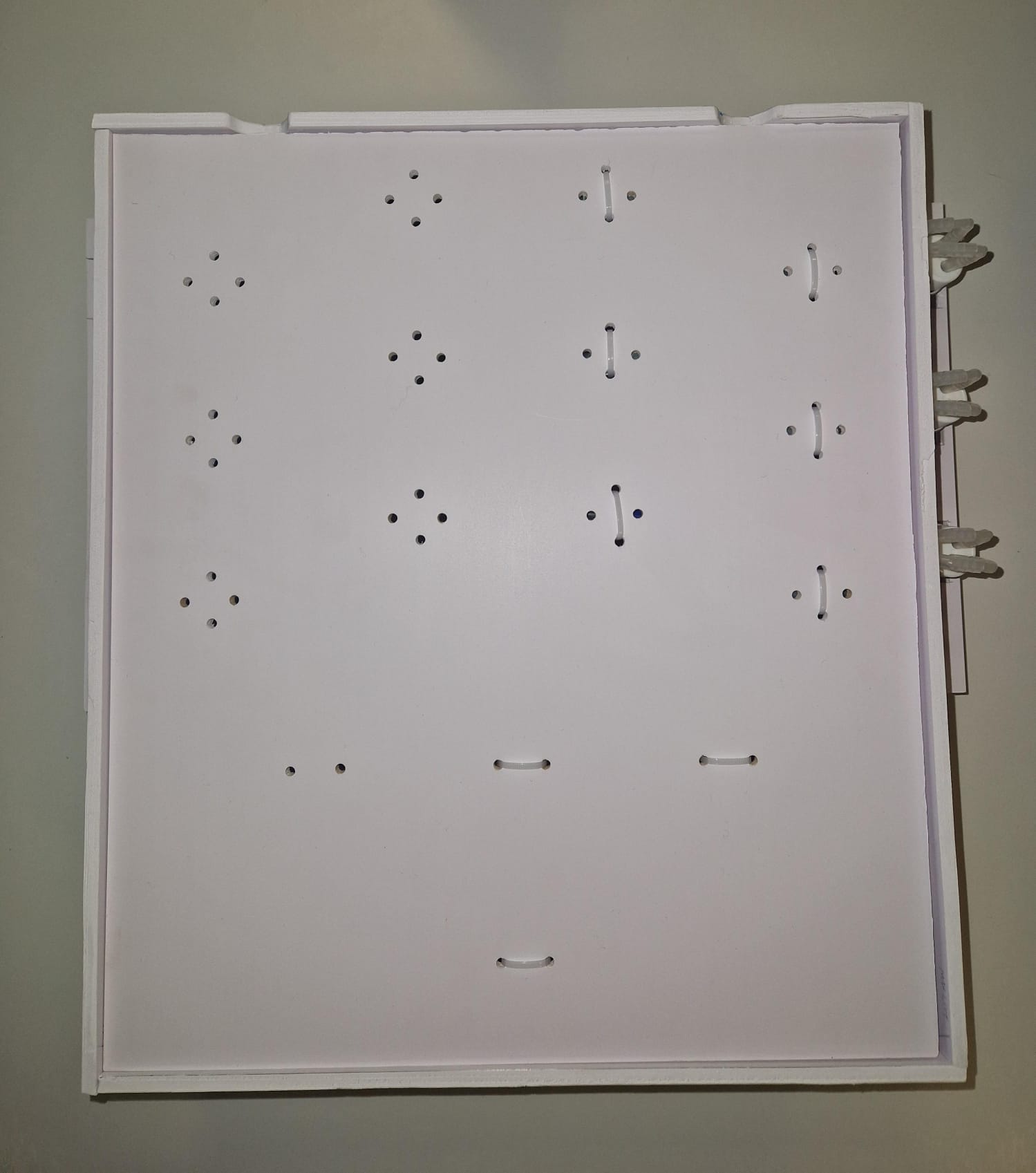 The roof of the box slots into the base box which is designed with a thumb indent to assist the experimenter to remove the roof when necessary. The roof supports up to 16 valves in designated positions and additional holes are cut out alongside each valve to allow for cable tie fixing of the valves to the box - this is to ensure a stable and robust final system.