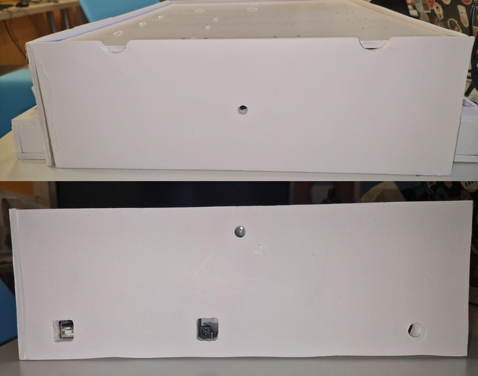 To construct the box, we opted for plastic board as our material of choice. While ideally, we would have utilised a laser cutter for precision, though it wasn't accessible to us at the time. Instead, we meticulously cut the pieces using a paper cutter, ensuring accuracy to the best of our abilities. The pieces were then seamlessly joined together using super glue. Additionally, we drilled holes to accommodate various components such as the tubing, Arduino ports, power supplies, and water supply tubes, ensuring a neat and organised assembly process.